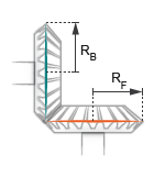 Ограничение конического зубчатого колеса параметризуется с точки зрения размеров кругов шага зубчатого колеса. Окружности шага представляют собой воображаемые окружности, концентричные телам зубчатых колес и касательные к точке контакта зубьев. Радиусы шага, помеченные RB и RF на чертеже - внешние радиусы, которые имели бы зубчатые колеса, если бы они были сведены к фрикционным конусам во взаимном контакте.