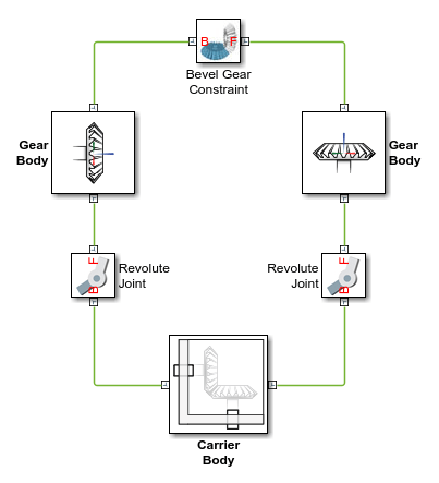 Ограничения зубчатой передачи возникают в замкнутых кинематических контурах. На рисунке показана топология с замкнутым контуром модели простого конического зубчатого колеса. Соединительные блоки соединяют тела зубчатых колес с общим приспособлением или водилом, определяя максимальные степени свободы между ними. Блок ограничения конического зубчатого колеса соединяет тела зубчатого колеса, устраняя одну степень свободы и эффективно соединяя движения зубчатого колеса.