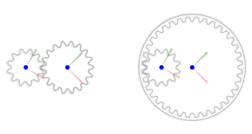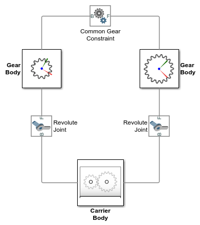 Ограничения зубчатой передачи возникают в замкнутых кинематических контурах. На рисунке показана топология с замкнутым контуром простой модели общей передачи. Соединительные блоки соединяют тела зубчатых колес с общим приспособлением или водилом, определяя максимальные степени свободы между ними. Блок ограничения общего зубчатого колеса соединяет тела зубчатого колеса, устраняя одну степень свободы и эффективно соединяя два движения зубчатого колеса.