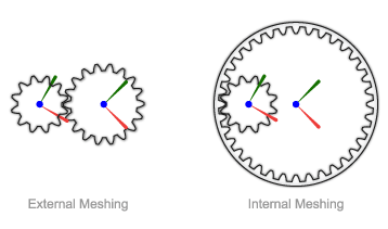Блок накладывает особые ограничения на относительные положения и ориентации рам зубчатых соединений. Ограничения гарантируют, что зубчатые колеса собираются только на расстояниях и углах, подходящих для создания сетки. Блок применяет ограничения во время сборки модели, когда он сначала пытается поместить зубчатые колеса в сетку, но полагается на остальную часть модели, чтобы сохранить зубчатые колеса в сетке во время моделирования.