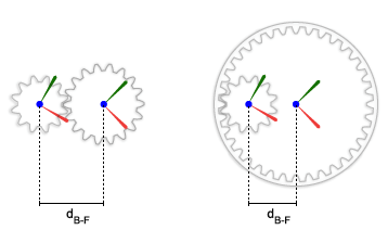 Расстояние между осями z основания и рамы толкателя, обозначенное на рисунке как dB-F, должно быть равно расстоянию между центрами зубчатых колес. Эта зависимость гарантирует, что оси вращения зубчатых колес находятся на соответствующем расстоянии для создания сетки.