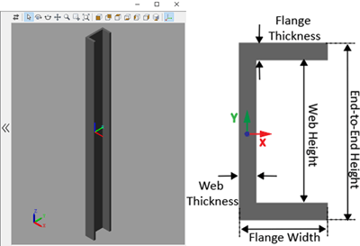 Геометрия балки C является выдавливанием ее поперечного сечения. Сечение балки, определенное в плоскости xy, выдавливается вдоль оси Z. Чтобы определить поперечное сечение, можно указать его размеры в разделе Геометрия (Geometry) диалогового окна блока. На рисунке показана С-образная балка и ее поперечное сечение. Опорная рамка балки расположена в центроиде полотна.