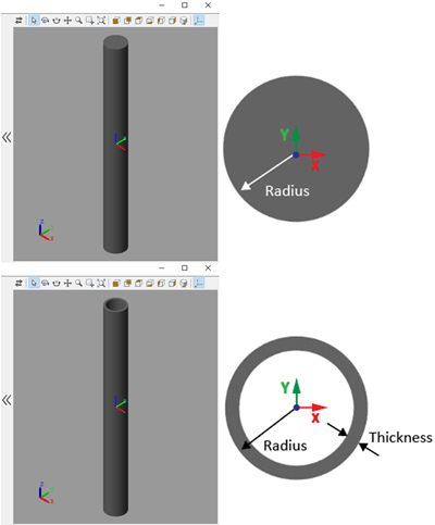 Геометрия цилиндрической балки является выдавливанием ее поперечного сечения. Сечение балки, определенное в плоскости xy, выдавливается вдоль оси Z. Чтобы определить поперечное сечение, можно указать его размеры в разделе Геометрия (Geometry) диалогового окна блока. На чертеже показана сплошная балка и полая балка. Опорная рамка расположена в центроиде балки.