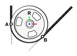 Шкив имеет одну локальную опорную рамку (порт R рамы) и две точки касания шнура (порты A и B ремня и кабеля). Опорная рамка расположена с началом координат в центре шкива и его осью Z вдоль оси вращения шкива. Точки касания шнура совпадают с местами, в которых шнур встречается или отделяется от шкива. Эти расположения могут изменяться во время моделирования. Ремень или кабель оборачивается вокруг шкива от порта А к порту В так, чтобы проследить дугу против часовой стрелки вокруг оси Z.