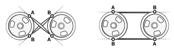 В замкнутой системе из двух шкивов, таких как ременной привод, соединения портов ремень-кабель определяют, пересекается или разомкнута геометрия шнура. Как показано на следующей схеме, в системе шкивов, в которой оси Z совмещены параллельно, если порт А одного соединяется с портом А другого, то шнур пересекается; если порт A одного порта подключается к порту B другого порта, то шнур разомкнут. Эффект тот же, если вместо переключения соединений портов одна из рам переворачивается так, что оси z шкивов противопараллельны.