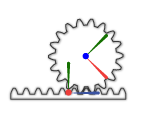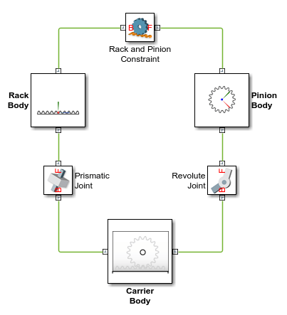 Ограничения зубчатой передачи возникают в замкнутых кинематических контурах. На рисунке показана топология с замкнутым контуром простой модели стойки и шестерни. Соединительные блоки соединяют тела рейки и шестерни с общим приспособлением или держателем, определяя максимальные степени свободы между ними. Блок ограничения реек и шестерен соединяет тела реек и шестерен, устраняя одну степень свободы и эффективно соединяя движения реек и шестерен.