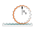 Реечно-зубчатое ограничение параметризуется с точки зрения размеров начальной окружности шестерни. Начальный круг представляет собой воображаемую окружность, концентричную корпусу шестерни и касательную к точке контакта зуба. Радиус шага, помеченный RB на рисунке - радиус, который имела бы шестерня, если бы она была уменьшена до фрикционного цилиндра в контакте с кирпичной аппроксимацией стойки.