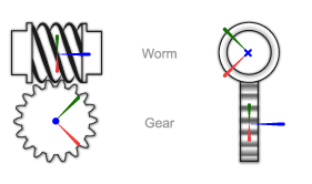 Блок зависимости червяка и зубчатого колеса представляет кинематическую зависимость между червячным и зубчатым телами, удерживаемыми под прямым углом. Порт базовой рамы идентифицирует соединительную раму на червяке, а порт ведомой рамы идентифицирует соединительную раму на шестерне. Оси вращения совпадают с осями z соединительной рамы. Червяк и шестерня вращаются с фиксированным отношением скоростей, определяемым радиусами шага шестерни или отношением зубьев к резьбе.