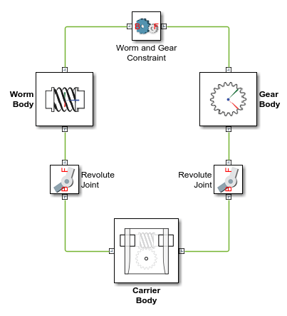 Ограничения зубчатой передачи возникают в замкнутых кинематических контурах. На рисунке показана топология с замкнутым контуром простой червячной и зубчатой модели. Соединительные блоки соединяют червячные и зубчатые тела с общим приспособлением или водилом, определяя максимальные степени свободы между ними. Блок зависимости червяка и зубчатого колеса соединяет червячные и зубчатые тела, устраняя одну степень свободы и эффективно соединяя червячные и зубчатые движения.