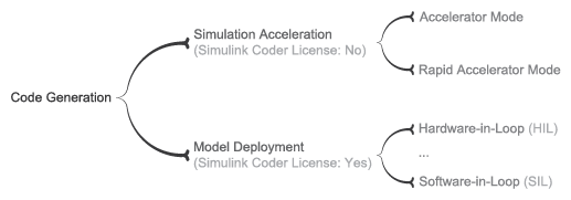 Simulink может генерировать исполняемый код C/C + + для сокращения времени моделирования. Два режима моделирования основаны на коде, сгенерированном из модели: