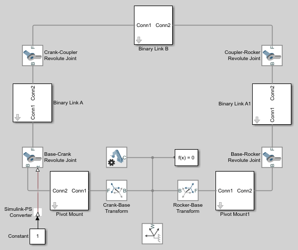 В этом примере выполняются две задачи. Сначала необходимо добавить в модель входной момент приведения в действие крутящего момента. Затем вы чувствуете движение кривошипа и коромысла относительно рамы Мира. Входной сигнал приведения в действие представляет собой крутящий момент, который прикладывается к соединению, соединяющему основание с кривошипно-шатунным звеном. Поскольку крутящий момент прикладывается к соединению, его можно добавить непосредственно через блок соединения. Блок, в который добавляется входной сигнал приведения в действие, называется «Поворотное соединение базового кривошипа» (Base-Crank Revolute Joint).