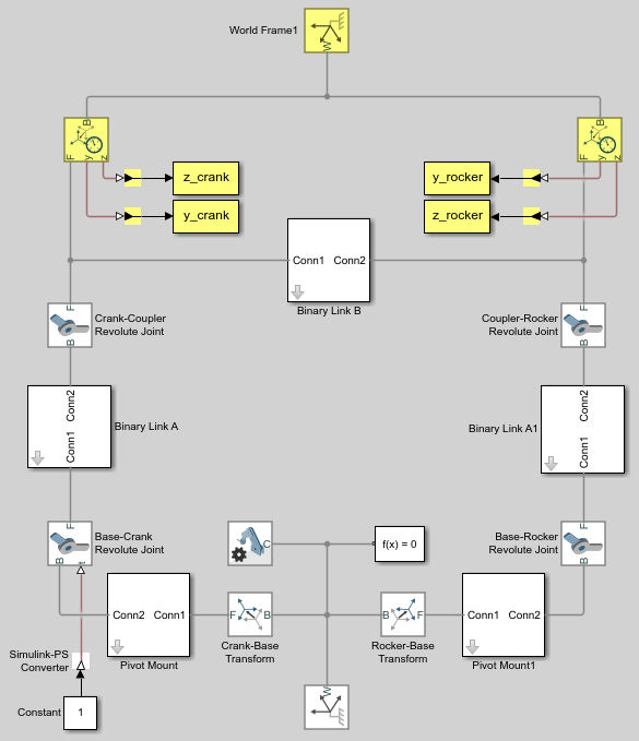 Подключите блоки и присвойте им имя, как показано на рисунке, поворачивая их по мере необходимости. Убедитесь, что блоки To Workspace с именами переменных z_crank и z_rocker соединяются с портами z-кадра блоков Transform Sensor. Новые блоки затенены желтым цветом.