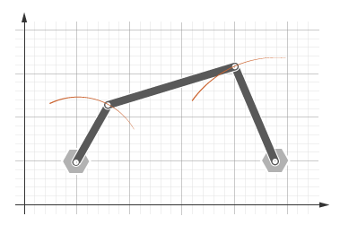 axis equal; grid on;На рисунке показан график, который открывается. Этот график показывает, что оба звена завершают полный оборот. Такое поведение характерно для двухкруговых связей.