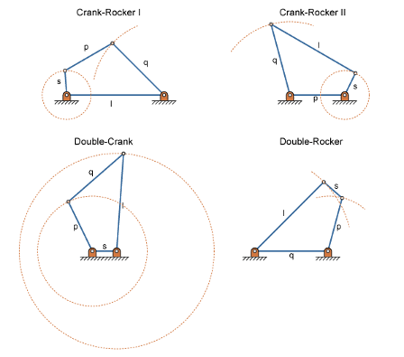 Путем изменения линии связи с землей можно изменить тип линии связи Grashof. Например, назначив кривошипно-шатунное звено кривошипно-коромыслового звена в качестве наземного звена, можно получить двухкривошипное звено. На рисунке показаны четыре связи, полученные путем изменения линии связи с землей.