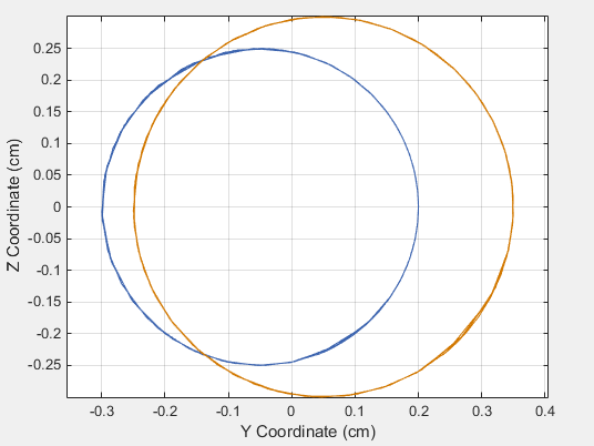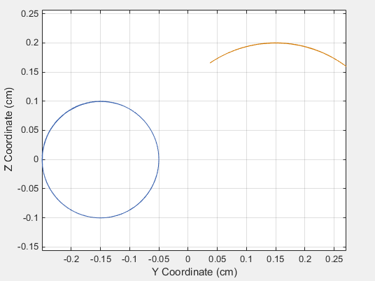 После завершения моделирования можно построить график координат положения концевых кадров связи ответвителя, например, введя следующий код в командной строке MATLAB: