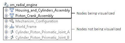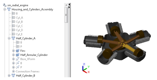 На рисунке показана часть панели древовидного вида sm_radial_engine показанного примера. Узел Half_Cylinder_A является дочерним для узла Housing_and_Cylinder_Assembly и родительским для узлов плавников и Half_Annular_Cylinder.