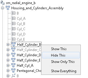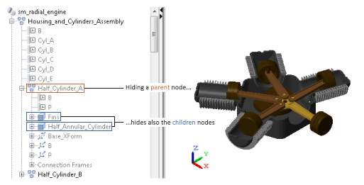 Любые изменения параметров визуализации узла дерева применяются в равной степени ко всем дочерним элементам этого узла, если таковые имеются. Узлы, расположенные выше в дереве модели, не затрагиваются. Как показано на следующем рисунке, скрытие узла Half_Cylinder_A в модели sm_radial_engine приводит к скрытию узлов Fins и Half_Annular_Cylinder (дочерних узлов), но не узла Housing_and_Cylinders_Assembly (родительского узла) или узла Half_Cylinder_B (родственного узла).