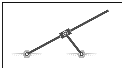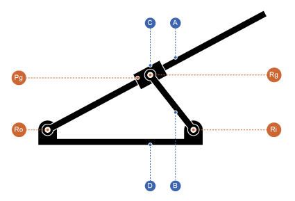 На рисунке показана схема системы, представляемой моделью. Эта система содержит четыре тела с меткой A-D. Эти тела соединяются в замкнутом контуре через четыре соединения, обозначенные Ri, Ro, Rg и Pg. При соединении друг с другом эти компоненты образуют систему с одной степенью свободы.