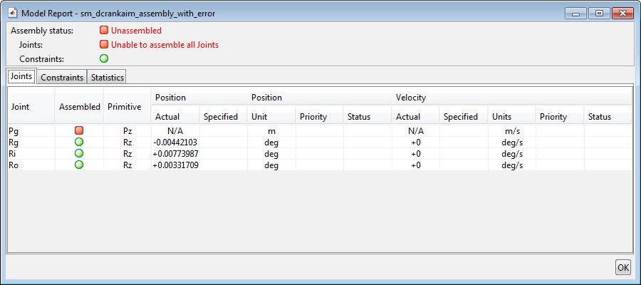 Mechanics Explorer предоставляет доступ к отчету о модели - утилите Simscape Multibody, которая суммирует статус сборки каждого соединения и ограничения в модели. Откройте эту утилиту, чтобы определить, какое соединение не удалось собрать. Для этого в строке меню Проводника Mechanics выберите Сервис > Отчет о модели.