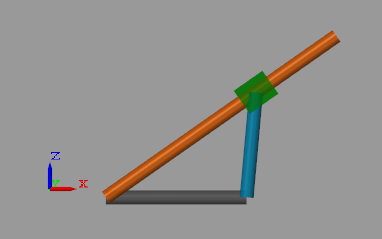 Две рамки смещены вдоль оси Z. Это смещение допустимо, так как соединение Pg содержит призматический примитив, выровненный с осью Z, обеспечивая кадрам одну степень свободы перемещения вдоль этой оси. Однако две рамы также поворачиваются относительно друг друга вокруг общей оси Z. Это смещение недопустимо, так как соединение Pg не содержит примитивов вращения или сферической формы и, следовательно, не имеет вращательных степеней свободы относительно любой оси. Чтобы исправить ошибку сборки модели, необходимо повернуть один из двух каркасов так, чтобы все их оси были параллельны друг другу.