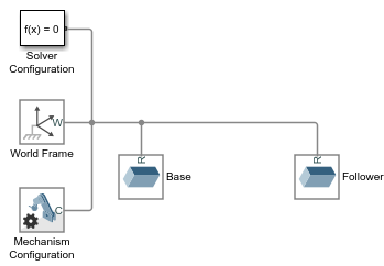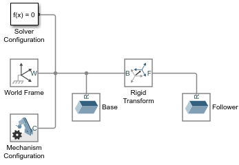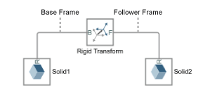 Метки порта кадра в блоке жесткого преобразования идентифицируют базовый и ведомый кадры. Полка, подключенная к порту B, служит в качестве базы. Рама, соединенная с портом F, служит в качестве толкателя. Реверсирование соединений портов изменяет направление, в котором применяется преобразование кадра.