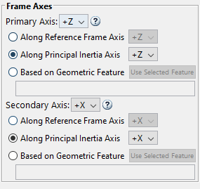 В разделе «Оси рам» > «Первичные оси» и «Оси рам» > «Вторичная ось» установите флажок «Вдоль главной оси инерции». Примите параметры оси по умолчанию (+Z и +X, соответственно) и нажмите кнопку «Сохранить». Диалоговое окно блока переключается обратно на основной вид (параметры).