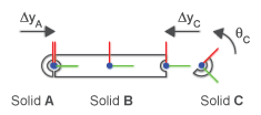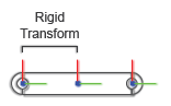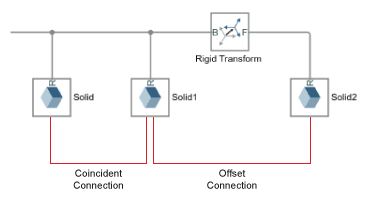 Соединения между портами кадров определяют пространственные отношения между их кадрами. Прямая линия соединения кадров делает соединенные кадры совпадающими в пространстве. Блок жесткого преобразования задает вращательное и поступательное смещения между кадрами. На рисунке показаны примеры совпадающих и смещенных соединений кадров.