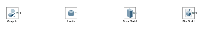 Порт кадра идентифицирует локальный кадр компонента. Например, порт R-кадра твердотельного блока идентифицирует локальный опорный кадр твердого тела. Каждый блок имеет один или несколько портов полки, которые соединяются для размещения связанных компонентов в пространстве. На рисунке показаны порты опорной рамы в нескольких блоках Body Elements.
