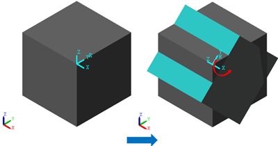На панели дерева щелкните узел «Жесткое преобразование». На следующем рисунке показан процесс и конечный результат вращения. В конечном результате подсвечивается твердое тело кирпича толкателя.