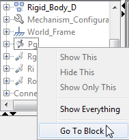 В контекстном меню выберите «Перейти к блоку». Simscape™ Multibody™ выводит блок-схему на передний план и выделяет блок, соответствующий выбранному узлу.