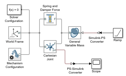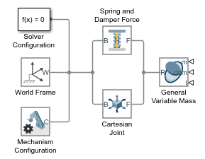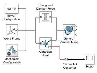 Создайте простую модель системы масса-пружина для моделирования в условиях постоянной массы и переменной массы. Модель использует блок «Общая переменная масса» для представления контейнера, в который постепенно сбрасывается груз песка. Блок декартового соединения предоставляет телу переменной массы три поступательные степени свободы, хотя во время моделирования релевантна только одна - вдоль вертикальной оси z. Блок силы пружины и демпфера представляет собой пружинный элемент, который соединяет тело переменной массы с рамой World.