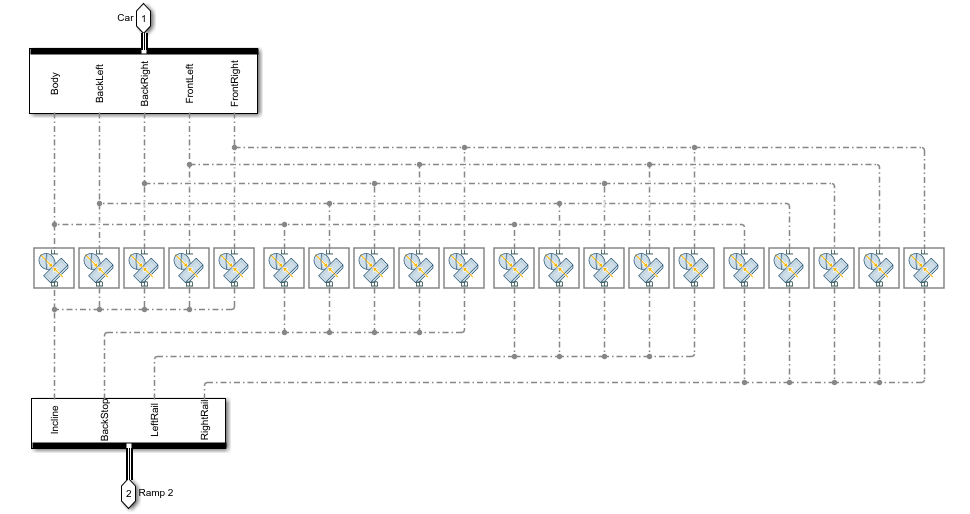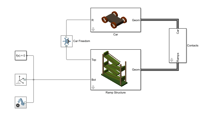 Модель выполнена из двух конструкций: Car и Ramp Structure. Блоки пространственной контактной силы, которые используются для моделирования контактных сил между каждым колесом автомобиля и пандусами, размещены в Car to Ramp подсистем.