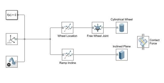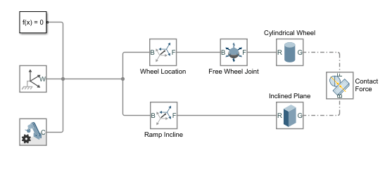 В этом примере показано, как создать систему, моделирующую колесо, катящееся вниз по наклонной плоскости с помощью блока «Сила пространственного контакта».