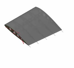 В этом примере показано, как применить несколько ограничений точки на кривой к одному телу. Пример основан на частичной модели закрылка самолета, который выдвигается и убирается при движении по изогнутым путям. Модель завершается добавлением зависимостей точка-на-кривой между двумя точками на створке и кривыми дорожки створки. На рисунке показаны результаты визуализации модели закрылка после ее завершения.