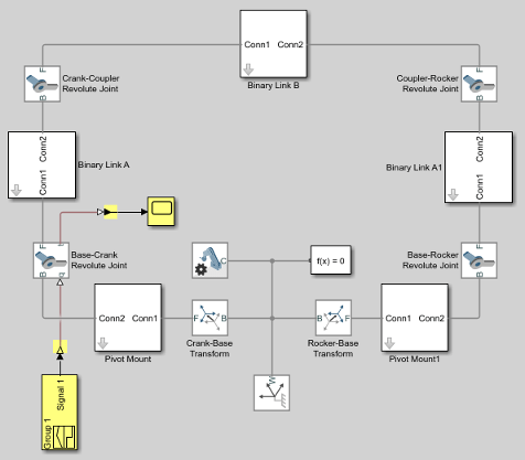 В командной строке MATLAB ® введитеsmdoc_four_bar. Откроется четырехлинейная модель. Эта модель создается в учебном пособии «Модель кинематической цепи с замкнутым контуром».