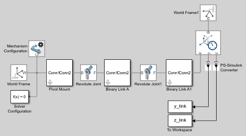 Подключите блоки к модели, как показано на рисунке. Необходимо подключить порт базового кадра блока датчика преобразования к блоку мирового кадра. Новые блоки затенены серым цветом.