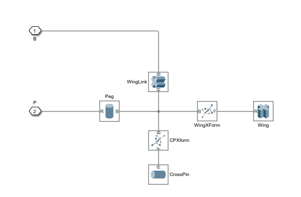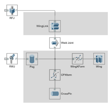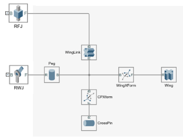 На рисунке показана уплощенная часть sm_cam_flapping_wing блок-схема. Блоки соединения с именемRFJ и RWJ отделяют блоки, составляющие тело справа (идентифицируемые затененной областью), от соседних тел, с которыми оно соединяется (не показаны).