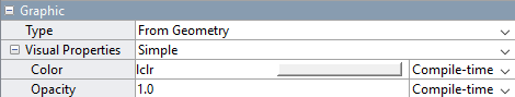 Разверните раздел Графические параметры. Блок использует Simple цветовая модель с визуальными свойствами твердого тела (цвет, непрозрачность), параметризованными в терминах переменных MATLAB (lclr) или указано численно (1.0).