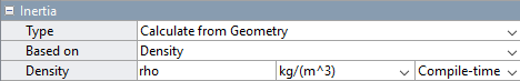 Разверните параметры инерции. Блок конфигурируется для вычисления основной части параметров инерции по геометрии и массовому параметру (Плотность). Этот параметр также параметризуется в терминах переменной MATLAB (rho).