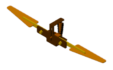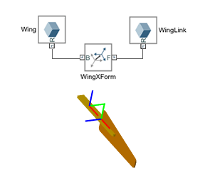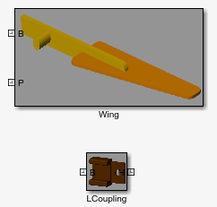На рисунке показан эффект добавления блока сварного соединения к блочной сети, которая первоначально состояла из одного тела. Этот соединительный блок делит тело на два тела, одно из которых содержит только блок цилиндрического тела с именем WingLinkа другой содержит остальные блоки «Цилиндрическое твердое тело» и «Жесткое преобразование». Блоки Гравитационного поля (Gravitational Field) в модели, если таковые имеются, будут в этом случае оказывать силу в вычисленном центре масс каждого тела.
