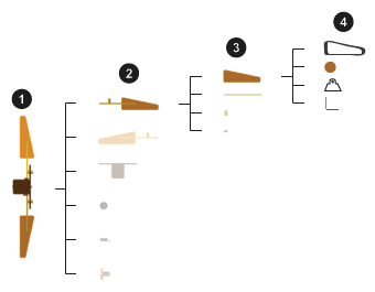 На рисунке обобщена структура типичного тела (здесь крыло) в контексте типичной многофюзеляжной модели (здесь хлопающий механизм крыла). Многокорпусные узлы (1) содержат тела (2), тела содержат тела (3) - часто все тела - и элементы тела содержат рамы и любые относящиеся к ним атрибуты материала (4).