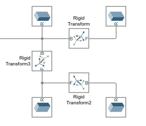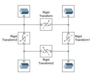 Блок «Жесткое преобразование» представляет фиксированную пространственную взаимосвязь между двумя кадрами. При каждом добавлении блока «Жесткое преобразование» к линии соединения рамы взаимосвязь совпадения, первоначально заданная этой линией, заменяется вращательным и поступательным смещением, заданным в диалоговом окне блока.