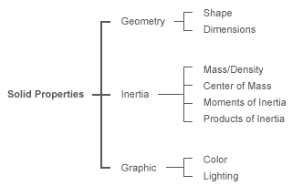 Атрибуты твердых тел включают инерцию и цвет. Геометрия позволяет автоматически вычислять параметры инерции и, в сочетании с цветом, визуализировать. Инерция количественно определяет сопротивление изменениям в движении и коэффициент при вычислении сил и моментов, необходимых для индукции ускорения.