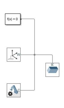 Если твердотельный блок не соединен, относительное размещение этого твердого тела не определено. Чтобы разрешить позу твердого тела - его положение и ориентацию - в модели, необходимо подключить порт опорной рамки (B) или, если вы предпочитаете, пользовательский порт рамки, принадлежащий твердотельному блоку. Например, соединение порта R с портом W блока World Frame позволит выровнять тело таким образом, чтобы его опорная рамка совпадала с мировой рамкой. На рисунке показано такое соединение