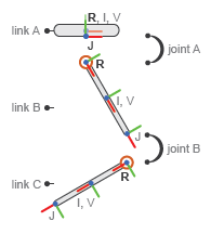 На рисунке показаны компоненты модели - звенья и соединения - и различные рамки, которые они содержат. R обозначает опорный кадр линии связи, I - инерционный кадр линии связи и V - визуальный кадр линии связи. J обозначает совместную опорную рамку - по определению, совпадающую с опорной рамкой дочернего звена. Инерционные и визуальные рамки смещены к центрам звеньев, а соединительные рамки - к их нижним краям.