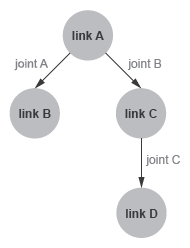 <robot name = "linkage"> <joint name = "joint A ... > <parent link = "link A" /> <child link = "link B" /> </joint> <joint name = "joint B ... > <parent link = "link A" /> <child link = "link C" /> </joint> <joint name = "joint C ... > <parent link = "link C" /> <child link = "link D" /> </joint> </robot>