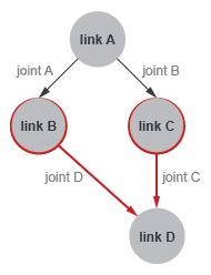 <robot name = "linkage"> <joint name = "joint A ... > <parent link = "link A" /> <child link = "link B" /> </joint> <joint name = "joint B ... > <parent link = "link A" /> <child link = "link C" /> </joint> <joint name = "joint C ... > <parent link = "link C" /> <child link = "link D" /> </joint> <joint name = "joint D ... > <parent link = "link B" /> <child link = "link D" /> </joint> </robot>