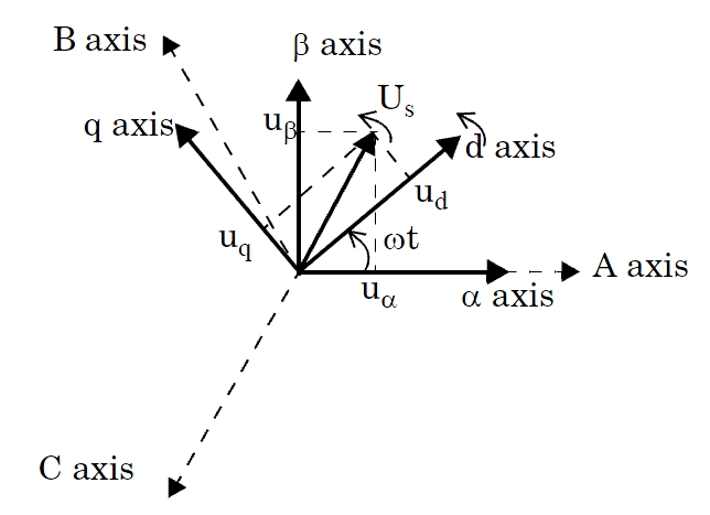 Выведите компоненты dq0 из сигналов abc, выполняя преобразование abc-αβ0 Кларка в фиксированной опорной системе отсчета. Затем выполните преобразование αβ0 в dq0 во вращающемся опорном кадре, то есть, выполняя поворот − (α.t) на пространственном векторе Us = uα + j· uβ.