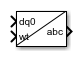 Блок от dq0 до abc использует обратное преобразование Park для преобразования вращающегося опорного кадра dq0 в трехфазный (abc) сигнал. Угловое положение вращающейся рамы определяется входным весом в рад.