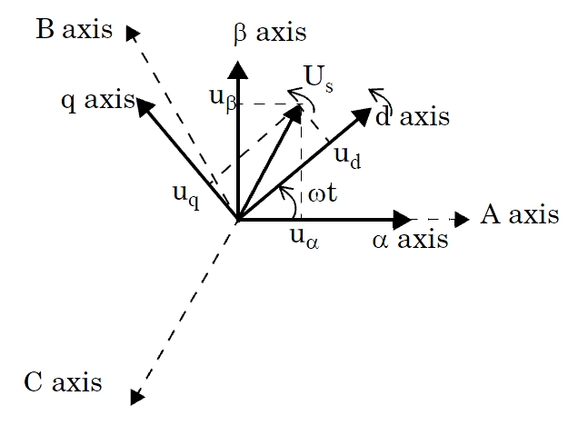 Преобразование abc-в-альфа-бета-ноль, применяемое к набору сбалансированных трехфазных синусоидальных величин ua, ub, uc, создает пространственный вектор Us, координаты uα и uβ которого в фиксированном опорном кадре изменяются синусоидально со временем. В противоположность этому преобразование abc-dq0 (преобразование Парка), применяемое к набору сбалансированных трехфазных синусоидальных величин ua, ub, uc, создает пространственный вектор Us, координаты ud и uq которого в dq вращающейся системе отсчета остаются постоянными.